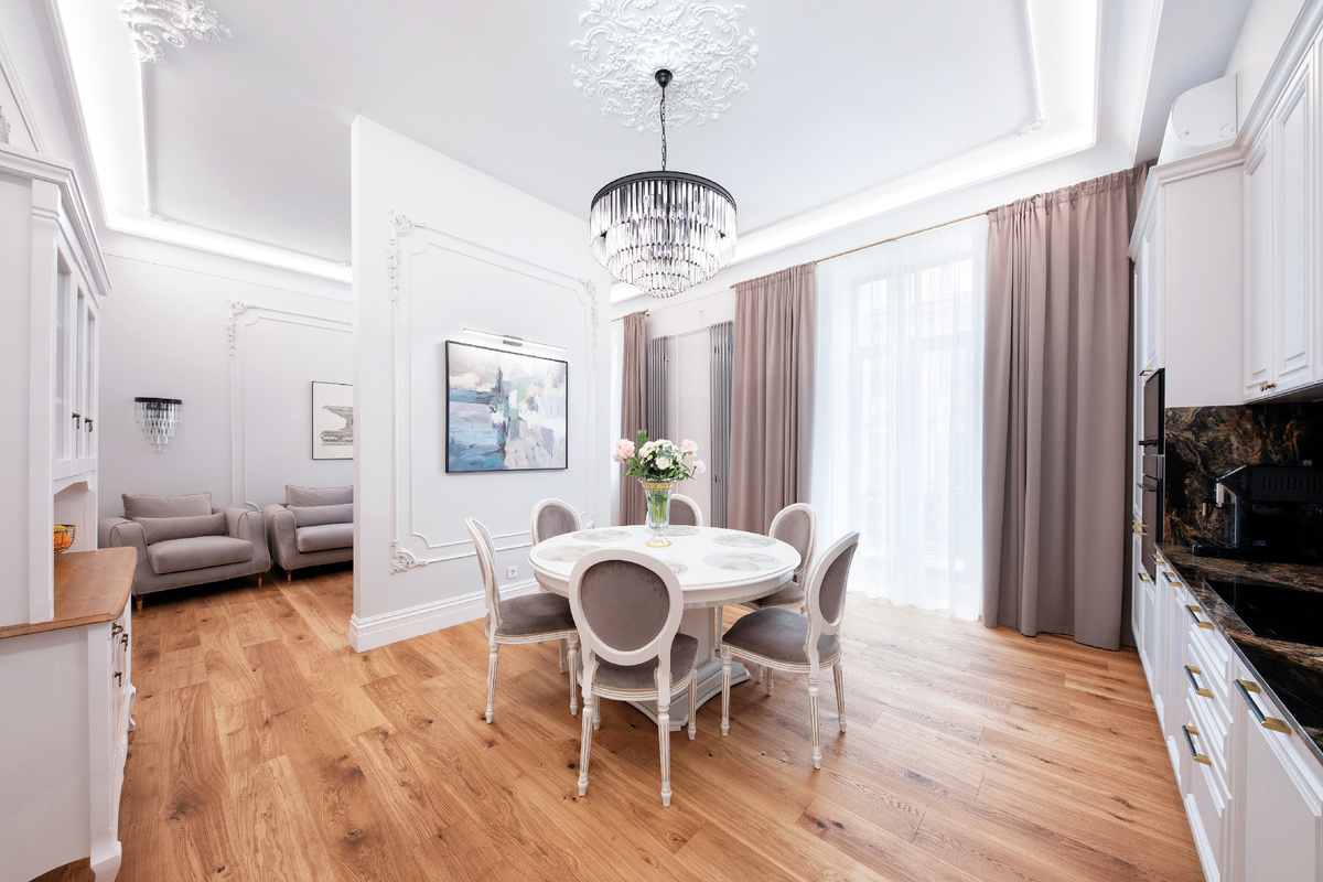 «Дизайнер Ольга Киричева создала очень продуманный проект, который по духу соответствует самому дому и месту», — Юлия Горшкова, художник, создатель росписей и картин для этого интерьера. Основной идеей проекта было создание гармоничного и утонченного интерьера в стиле современная классика cдержанного и аристократичного одно- временно. Исполнить мечту заказчиков — жить в центре Петербурга и наслаждаться принадлежностью к нему. Дизайнер мастерски справился с задачами перепланировки, создав просторную кухню-гостиную с выходом на балкон и видом на один из центральных проспектов города, мастер-спальню с гардеробной и санузлом, уютную и функциональную детскую для двух дочерей, ванную комнату со спрятанной от глаз постирочной. Все угловатые формы были отведены санузлам, в то время как жилые пространства приобрели правильные геометрические очертания и максимальную функциональность. Кухня почти незаметна и уступает центральное место парадной обеденной группе с круглым раскладным столом. Вся кор