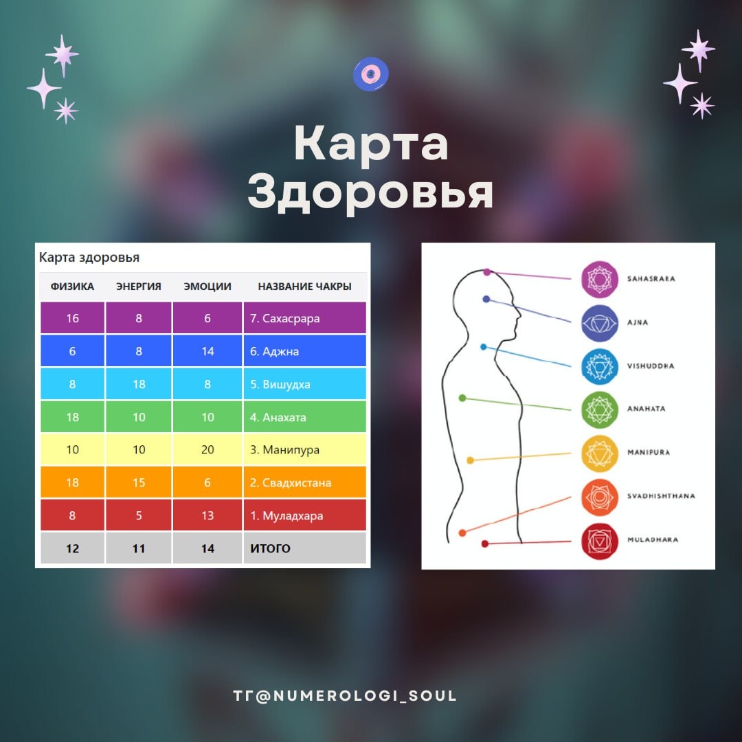 🔮Наш мир соткан из невидимой энергии, как и человек представляет энергетическую систему. 🌪в теле человека есть 7 базовых воронок, которые принимают и отдают энергию с помощью которой мы взаимодействуем с миром. Матрица Судьбы – это инструмент, отражающий проводимость энергий человеков в данном воплощении. Матрица строится на 7 центрах, чакрах. Которые располагаются снизу вверх⬆️ ❤️муладхара чакра 🧡свадхистана чакра 💛манипура чакра 💚анахата чакра 🩵вишудка чакра 💙аджна чакра 💜сахасрара чакра Где через каждый центр протекает та или иная энергия (аркан), влияющий на проявление человека и его физическое, ментальное и эмоциональное состояние. 🔵для базового ознакомления с чакральной системой в Матрице и здоровьем, мы с вами возьмем не полностью всю карту здоровья , а только главный столб располагающийся в самой матрице. Каждый аркан по чакре отвечает за разные проявления и через анализ своих арканов можно посмотреть на свое физическое и ментальное состояние. И что бы идти в работу г