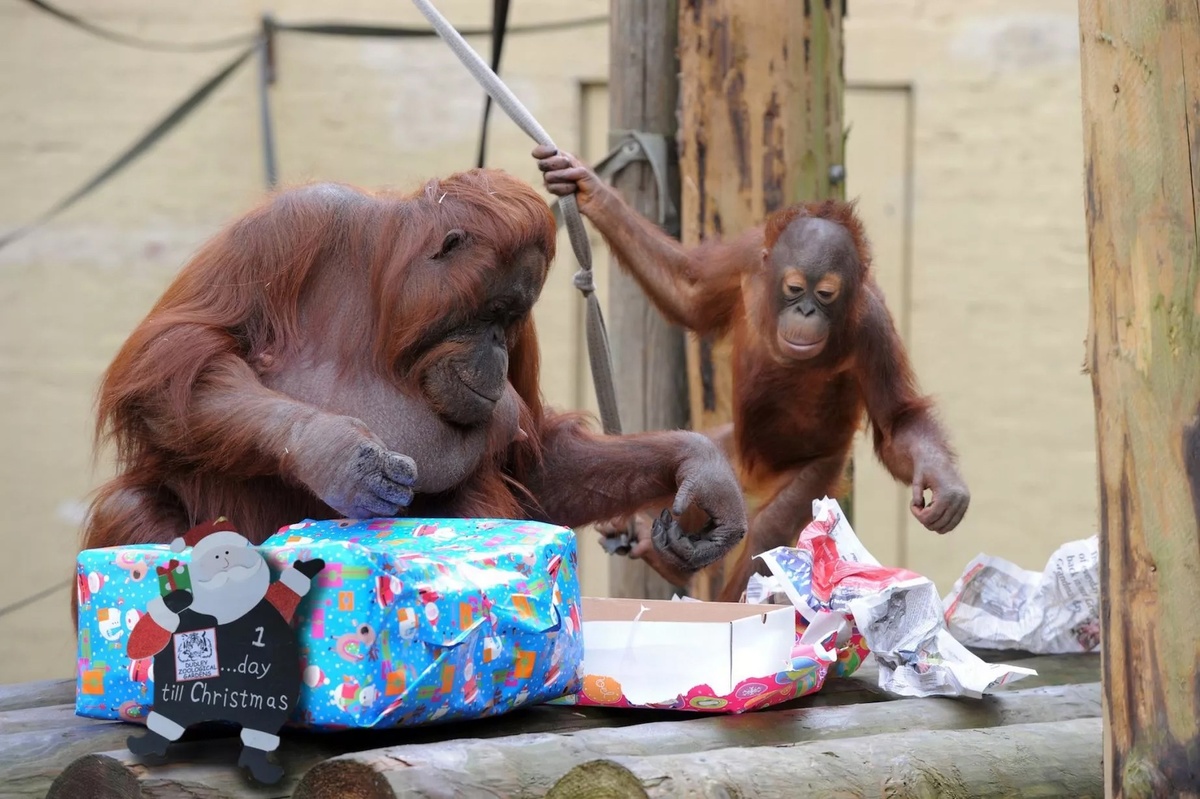 На этих фото трёхлетняя девочка-орангутан Спраут разворачивает вкусные рождественские подарки вместе со своей мамой Джаз. Санта-Клаус нанёс ранний визит в зоопарк Дадли (Великобритания). А какой ребёнок не поиграет и с коробкой от подарка? Спасибо за материал паблику Большие человекообразные обезьяны. Источник-1, Источник-2 🦍 Вам также будет интересно: