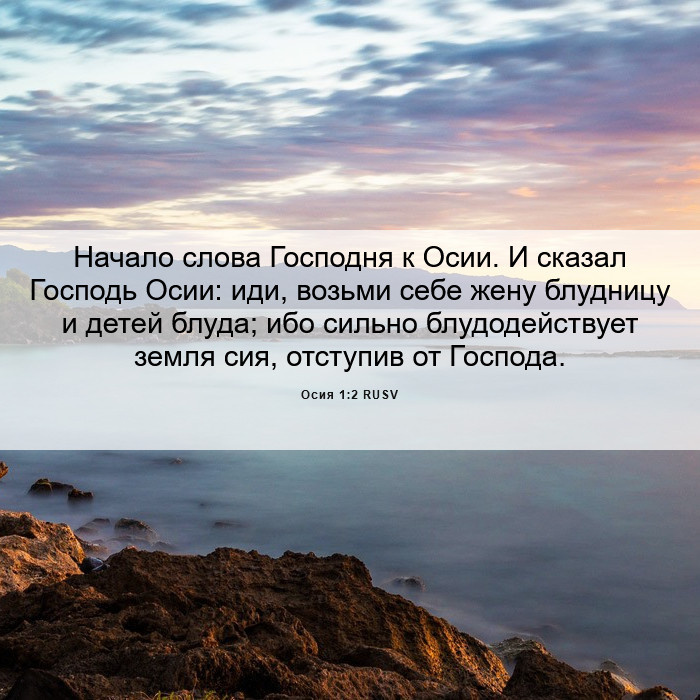 Стих 2. Обратившись к Осии в начале, Бог приказал ему взять себе жену-блудницу. Еврейское слово «блудница» (знуним) — это общий термин для блуда или проституции. Оно может означать женщину неразборчивых связей, обычную проститутку или проститутку при храме, участвующую в обрядах плодородия Ваала.