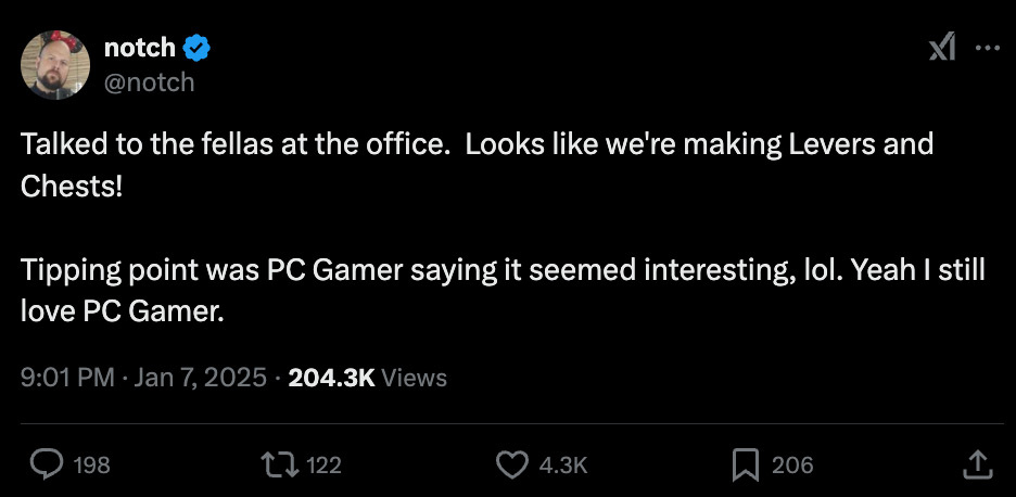 Маркус "Notch" Перссон, создатель оригинального Minecraft, отменил планы по разработке духовного наследника знаменитой песочницы. Вместо этого разработчик сосредоточится на создании рогалика от первого лица. В начале года Перссон предложил своим подписчикам в социальных сетях выбрать его следующий игровой проект — пошаговый рогалик с видом от первого лица или духовного преемника Minecraft. Несмотря на то, что сообщество проголосовало за второй вариант (81% голосов), Нотч решил пойти другим путем. В новом посте разработчик объявил о начале работы над игрой Levers and Chests — пошаговым рогаликом в стиле классических данженкроулеров с системой партийных сражений. По словам Перссона, этот проект намного интереснее, чем "очередная грустная попытка эксплуатировать ностальгию". В обсуждении с фанатами Нотч раскрыл подробности Levers and Chests — игра будет сочетать механики традиционных рогаликов с атмосферой олдскульных подземелий, где игроки управляют группой персонажей от первого лица. Ид