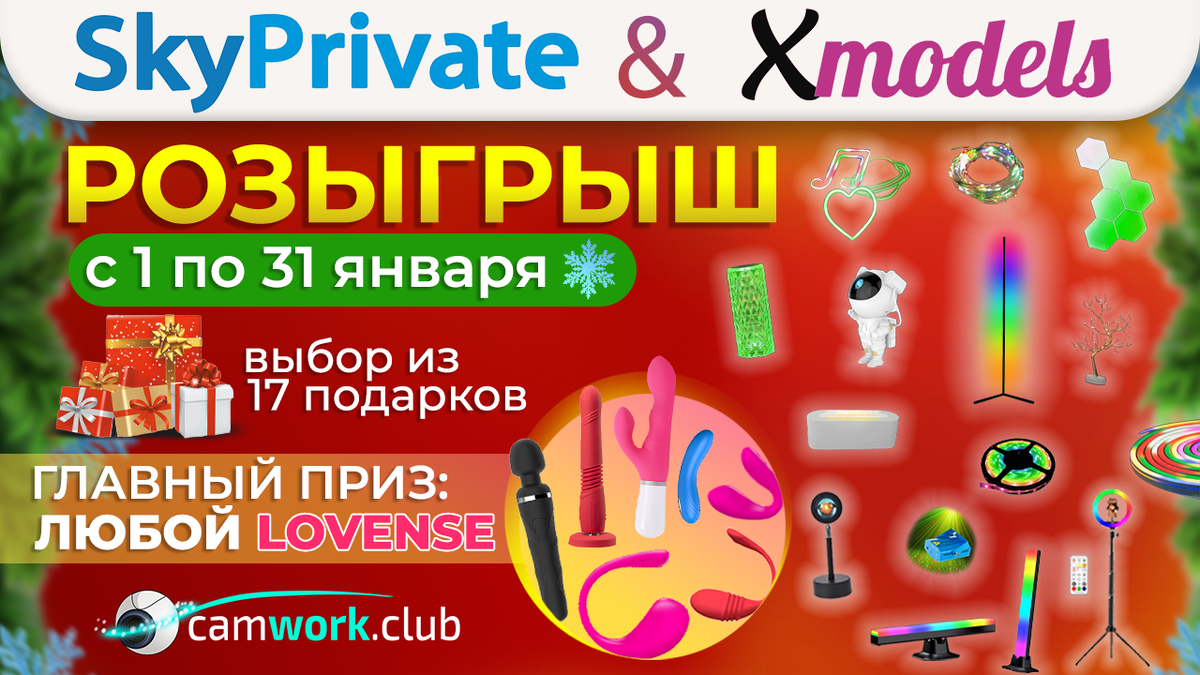 Заработайте за весь месяц минимум 10💲 на сайте XModels ❤️ и(или) SkyPrivate ❤️ 🎁Главный приз - Любая* игрушка от Lovense, включая новинки! (https://ru.lovense.com/public/store) 💪 🎁 А также пятеро победителей смогут выбрать: Аромадиффузор (https://www.youtube.com/shorts/knhy8GzUqZw), Неоновые фигурки в ассортименте (https://www.youtube.com/shorts/AovYml_zQJA), Гирлянду на фон (https://www.youtube.com/shorts/X8M-CrKYw8Q), Лампу "SUNSET" (https://www.youtube.com/shorts/UTlbPpAbSA4), "Соты" (https://www.youtube.com/shorts/RLQ8puNb0m0), "Дерево" (https://www.youtube.com/shorts/IUyOdf0F8xg) или "Кристалл" (https://www.youtube.com/shorts/vYSE_EYXJog), Лазерный проектор (https://www.youtube.com/shorts/DH4PwluIZro)или звездный (https://www.youtube.com/shorts/3iPiIhZN0KU), электро-гирлянду (https://www.youtube.com/shorts/tmSmNQItTxU) Светодиодные ленты (https://www.youtube.com/shorts/Td2wOTzT8QM), Кольцевую лампу (https://www.youtube.com/shorts/51ySoWt6qgE) или кольцевую двухстороннюю лампу