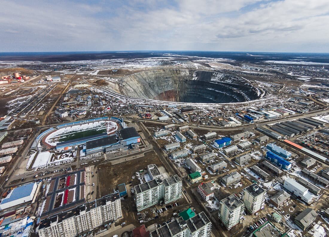 Алмазный карьер «Мир» — один из самых известных и впечатляющих объектов горнодобывающей промышленности России. Этот гигантский карьер, расположенный в Республике Саха (Якутия) 🏔️, привлекает внимание не только своей масштабностью, но и историческим, экономическим и техническим значением. Карьер «Мир», известный также как кимберлитовая трубка «Мир», является одной из крупнейших в мире алмазоносных трубок. Его диаметр составляет около 1,2 километра 🌍, а глубина достигает 525 метров, что делает его одним из самых глубоких открытых карьеров в мире. Кимберлитовая трубка была обнаружена в 1955 году геологами советской экспедиции во главе с Юрием Хабардиным 🔍. Это открытие стало поворотным моментом для алмазодобывающей отрасли СССР. Разработка месторождения началась в 1957 году, и вскоре карьер стал ключевым объектом для добычи алмазов в стране. Карьер «Мир» на протяжении десятилетий был основным источником высококачественных алмазов для СССР, а затем и для современной России. 💎
