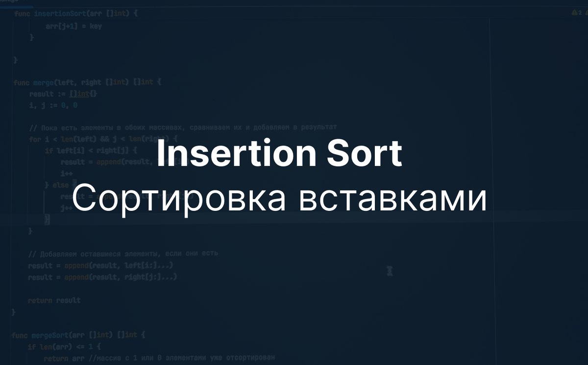 Сортировка вставками — это один из самых интуитивно понятных алгоритмов сортировки. Он напоминает способ, которым мы раскладываем карты в руке, упорядочивая их по возрастанию или убыванию. Этот алгоритм особенно удобен для небольших массивов и обучающих примеров. Сортировка вставками — это алгоритм, который проходит по массиву, берет каждый элемент и вставляет его в соответствующую позицию в уже отсортированной части массива. Рассмотрим массив [9, 5, 1, 4, 3]: Временная сложность: Память: Плюсы: Минусы: Сортировка вставками — это удобный алгоритм для небольших задач или изучения основ алгоритмов. Несмотря на ограниченную производительность, его концепция активно используется в других, более сложных алгоритмах, таких как сортировка Shell. Также у меня есть Telegram-канал, где я пишу намного чаще. Буду рад.