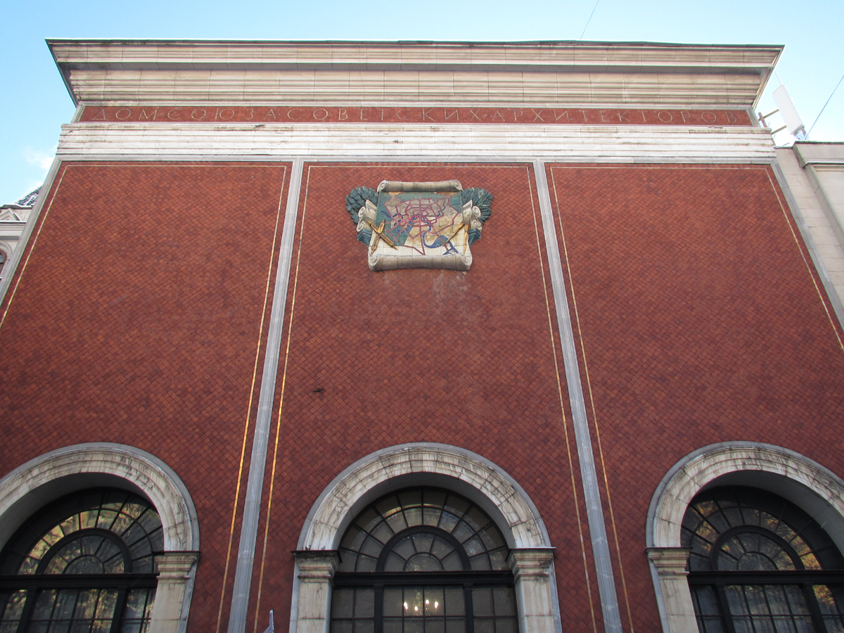 Мы вошли в центральную часть здания ЦДА через главный вход с арочными порталами из красного кирпича, над которыми расположено панно Фаворского. Центральную лестницу снять не смогли - она была задрапирована тяжёлыми гардинами. Удалось снять через стекло только интерьеры бокового помещения с атлантами, в котором размещается Клуб партнёров Союза московских архитекторов.
