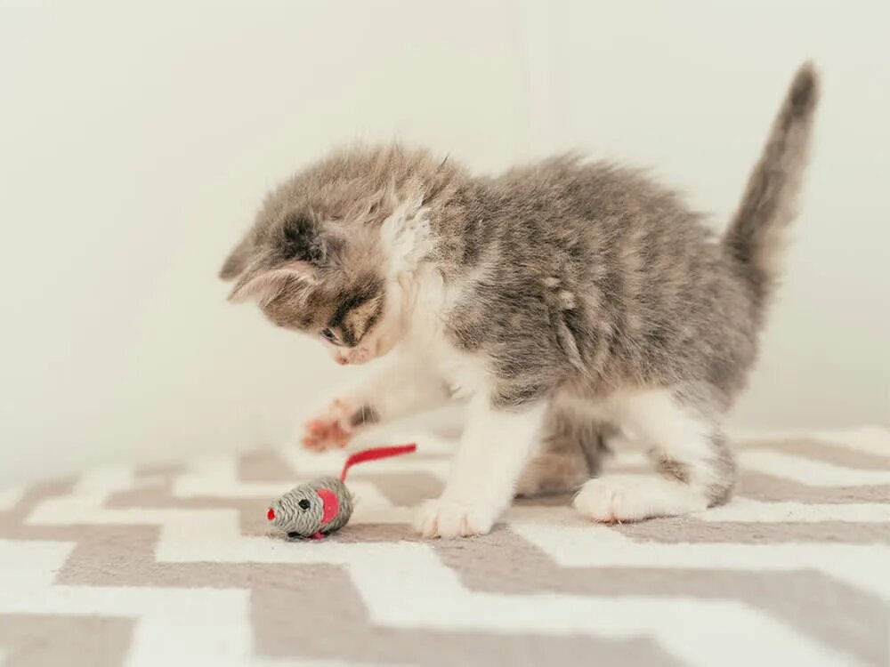 - Подбирайте безопасные игрушки. Подойдут варианты из натуральных материалов, таких как ткань, фетр, мех, джут, картон или дерево. Важно убедиться, что все детали надёжно закреплены и котёнок не сможет их отгрызть и случайно проглотить.