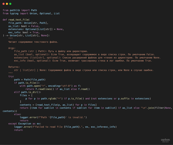 Функция для чтения текстовых файлов предоставляет возможность чтения содержимого текстовых файлов, включая возможность чтения файлов из директорий, фильтрацию по расширению и гибкий формат возвращаемых данных. Она поддерживает чтение как отдельных файлов, так и всех файлов с определенными расширениями внутри директории (включая поддиректории).