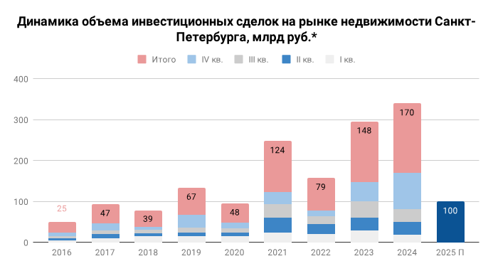 Инвестиции в объекты недвижимости Северной столицы выросли по итогам 2024 года на 15%. Аналитики обращают внимание на то, что иностранные инвесторы стали реже избавляться от своих активов в России. В 2025 году рынок может стабилизироваться за счет репатриации капиталов. По предварительным данным консалтинговой компании IBC Real Estate, совокупный объем инвестиций в недвижимость Санкт-Петербурга по итогам 2024 года составил 170 млрд руб., что на 15% выше рекордного показателя прошлого года. Интересным фактом является то, что если в 2023 году около 40% в общем объеме вложений было сформировано за счет продаж иностранными инвесторами своих российских активов, то в этом году на подобные транзакции пришлось лишь 11%, снизившись в абсолютных значениях в 3 раза и составив 19 млрд руб. *В объеме инвестиций учитываются сделки, подразумевающие рассрочку или отложенные платежи "расчеты по продаваемым площадям". Объем сделок за период 2010-2021 годы рассчитан по среднему курсу доллара за каждый кв