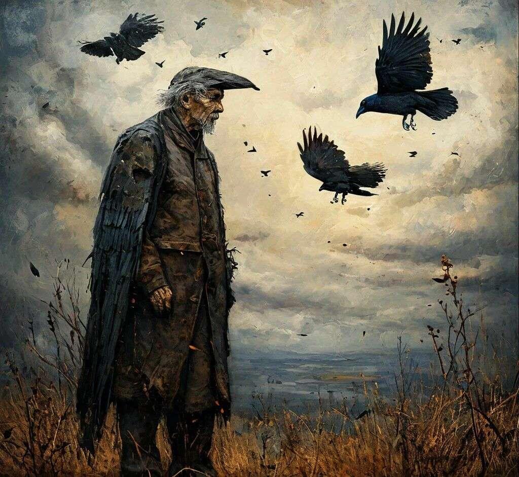Ворон пролетел над толкающим скрипучую тележку ребёнком и прокричал, -Карр! Мальчик остановился и перекрестился, -Не бойся ничего и молчи,- попросил старик. Мальчик кивнул. -Это смерть идёт по нашим следам,- произнес старик сидящий в тележке,- Стоит мне засомневаться в этой жизни, так она уже рядом. И ждёт. Ждёт… Не дождётся!!! — А что если дождусь?- послышалось из тьмы Мальчик с любопытством осмотрелся по сторонам. -Но ты же не дура ждать одного меня?- прокричал во тьму старик -Ты не последний!- ответила Смерть и подошла к тележке. -Тогда закончи всё как можно скорее!- попросил старик -Так не интересно! Мальчишка должен научиться меня бояться! -Значит у меня ещё есть время! -Да, ты можешь еще пожить… Мальчик засмеялся. -Что тебя рассмешило?- удивилась Смерть -Ты! Если я вырасту смелым, то никому не придётся умирать! Старик и Смерть переглянулись. -А знаешь почему он тебя не будет бояться?- спросил старик -Почему? -Поехали, — обратился к мальчику старик и обернувшись к Смерти, добавил,