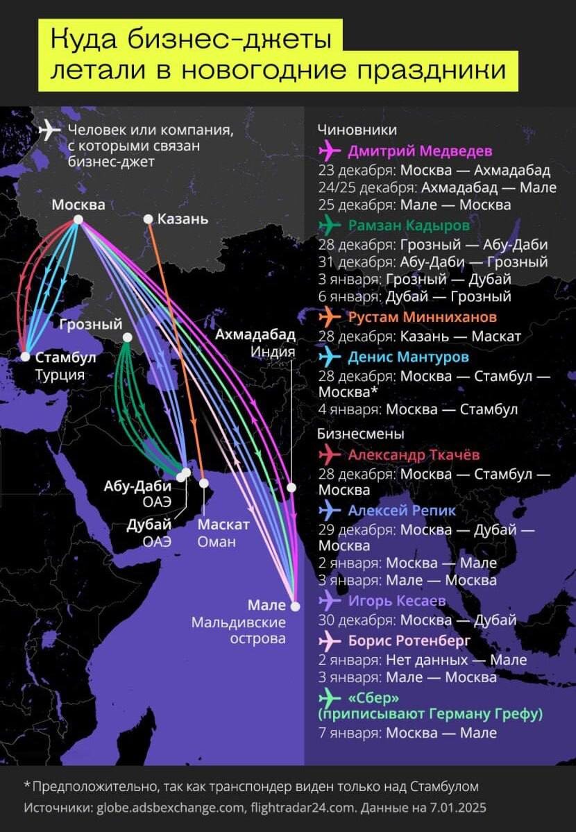 В то время как простые граждане России праздновали Новый год дома, многие высокопоставленные чиновники и олигархи выбрали для себя роскошный отдых за границей. Бизнес-джеты знаменитостей и депутатов совершали перелёты в ОАЭ, на Мальдивы и другие экзотические курорты, наводя на размышления о том, как живёт наша элита, когда обычные россияне встречают Новый год в условиях кризиса. Поразительно, но борт Рамзана Кадырова дважды воспользовался прямым рейсом в ОАЭ, демонстрируя, что его активная дипломатия и деловая жизнь не знают границ. А вот самолёт Алексея Репика, кажется, использовался даже семьёй президента в этот праздничный сезон — умело скрытая связь высоких чинов с бизнесом вызывает множество спекуляций и обсуждений в обществе. Не остаются в стороне и другие влиятельные фигуры. Дмитрий Медведев и Герман Греф выбрали отдых на Мальдивах — острова, о которых мечтают многие, но доступные, по всей видимости, лишь немногим. При этом перед праздниками борты высокопоставленных лиц часто