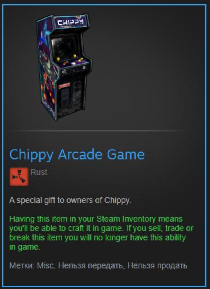 Первым делом, для того чтобы получить игровой автомат Chippy Arcade Game, нужно купить игру Chippy в Steam. После самой покупки, заходим в игру, проводим в ней около 20-30 минут. Выходим из игры, заходим в раст проводим некоторое время, после наш Игровой автомат уже у нас в инвентаре. Жду ваших комментариев дорогие друзья ❤️
