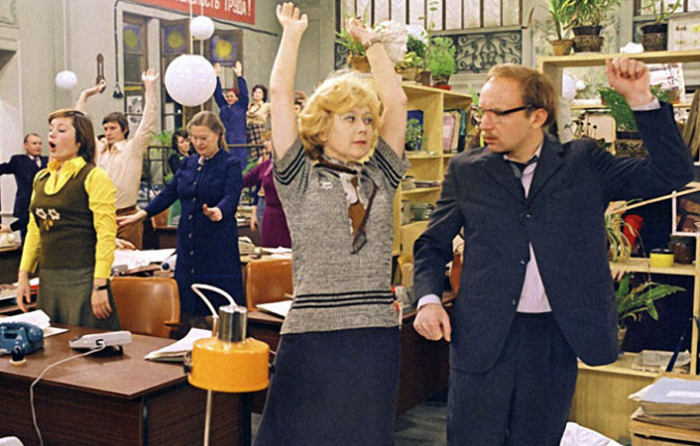 Например, в окончательную версию не вошла производственная гимнастика, которой занимаются сотрудники статистического управления. В Советском Союзе долгое время такая гимнастика была обязательной и на рабочих местах, и в школах, и в институтах: чтобы сохранить здоровье граждан, особенно ведущих малоподвижный образ жизни, из буквально заставляли выполнять физические упражнения. Легко догадаться, что энтузиазма это начинание не вызвало: попробуйте делать махи ногами или наклоны, когда на вас неудобная узкая юбка! Поэтому обычно к производственной гимнастике относились, как к досадной необходимости, упражнения выполняли вяло и без «огонька».