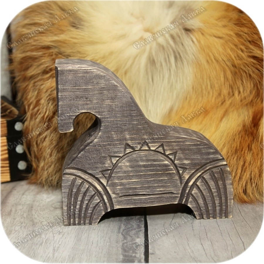 Игрушка «Коник-солнце» Благодарность мастеру: 1490 - Заявки можно скидывать на WhatsApp по номеру телефона 8-913-367-4141 Игрушка «Коник-солнце» входит в нашу новую линейку статуэток, специально подготовленную для тех, кому наиболее важна историческая достоверность. Фигурку-панки сложно назвать кумиром, хотя внешний вид и атрибутика схожи; скорее это игрушка, наследующая древние традиции язычества и шаманизма. Мастер старался воспроизвести исконный вид, насколько это возможно. Такая фигурка, несомненно, представляет ценность для приверженцев культуры наших славных предков и их ближайших соседей. Если говорить о предназначении данной панки в доме, то это уже более современное представление о Символе движения солнца. У нас эту роль впоследствии занял Даждьбог и отсюда фраза «Дождьбоговы кони». Этот коник с символом солнца вечен и он олицетворяет ход солнца по небосводу. Эта фигурка не антропоморфмна, но всегда присутствует в линейке статуэток Панки, так как солнце почитали везде и всегда