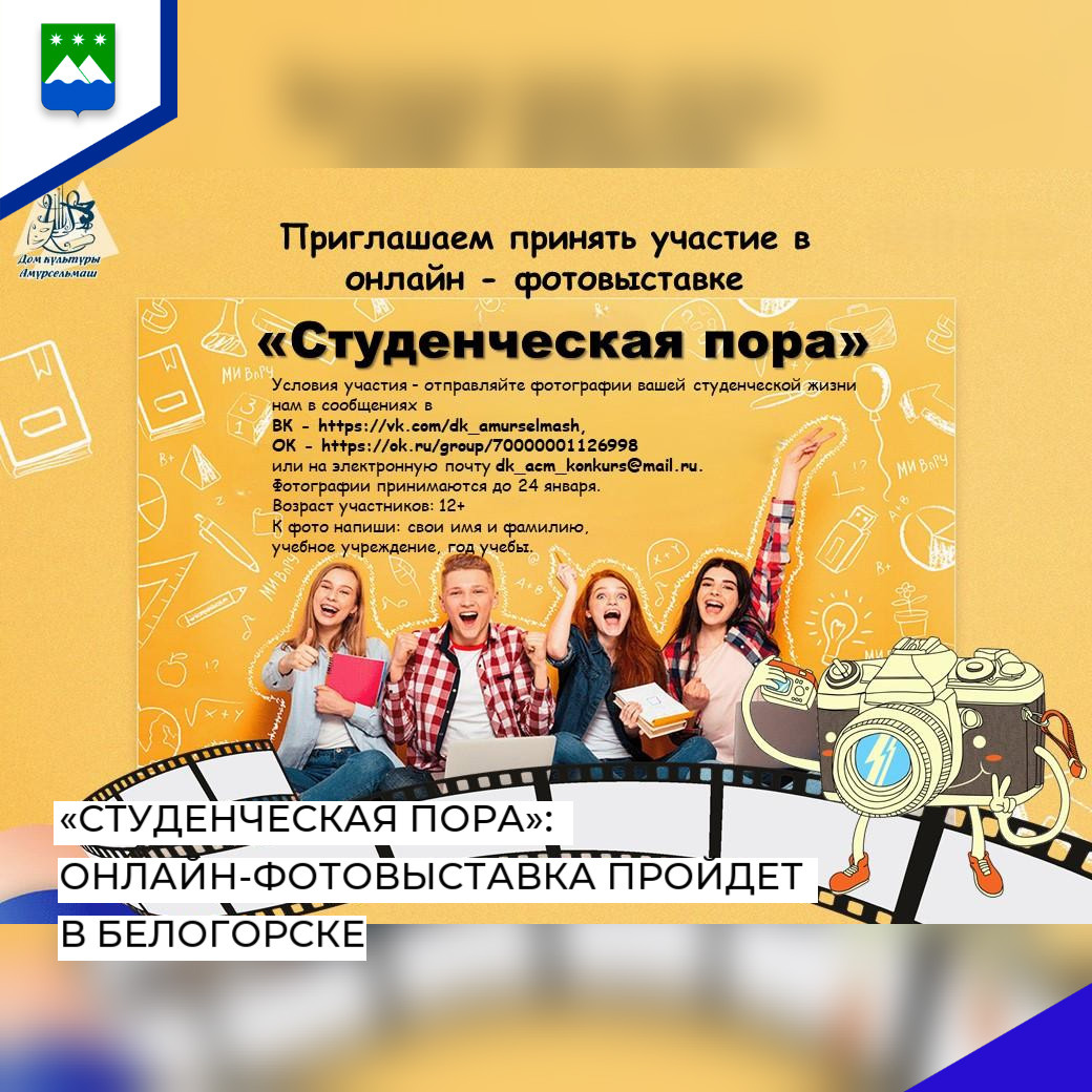 Дом культуры «Амурсельмаш» Белогорска приглашает принять участие в онлайн фотовыставке «Студенческая пора». — 25 января отмечается День студента. К этому дню мы решили организовать фото-выставку, — рассказала директор ДК «Амурсельмаш» Маргарита Терещенко. — Все присланные фотографии будут размещены 24 января в рамках нашей онлайн-выставке и опубликованы на всех наших страницах в социальных сетях. Не упустите возможность показать свои лучшие моменты студенчества! Мы с нетерпением ждем ваши фотографии! Фотографии принимаются до 24 января. Вместе с фотографией необходимо указать ФИО, учебное заведение, год учебы. Прислать свои фотографии студенческой жизни можно в сообщения соцсетей ВК (https://clck.ru/343N5B), ОК (https://clck.ru/343N5C) или на электронную почту dk_acm_konkurs@mail.ru. Количество фотографий – неограниченно. Все участники получат грамоты и дипломы.
