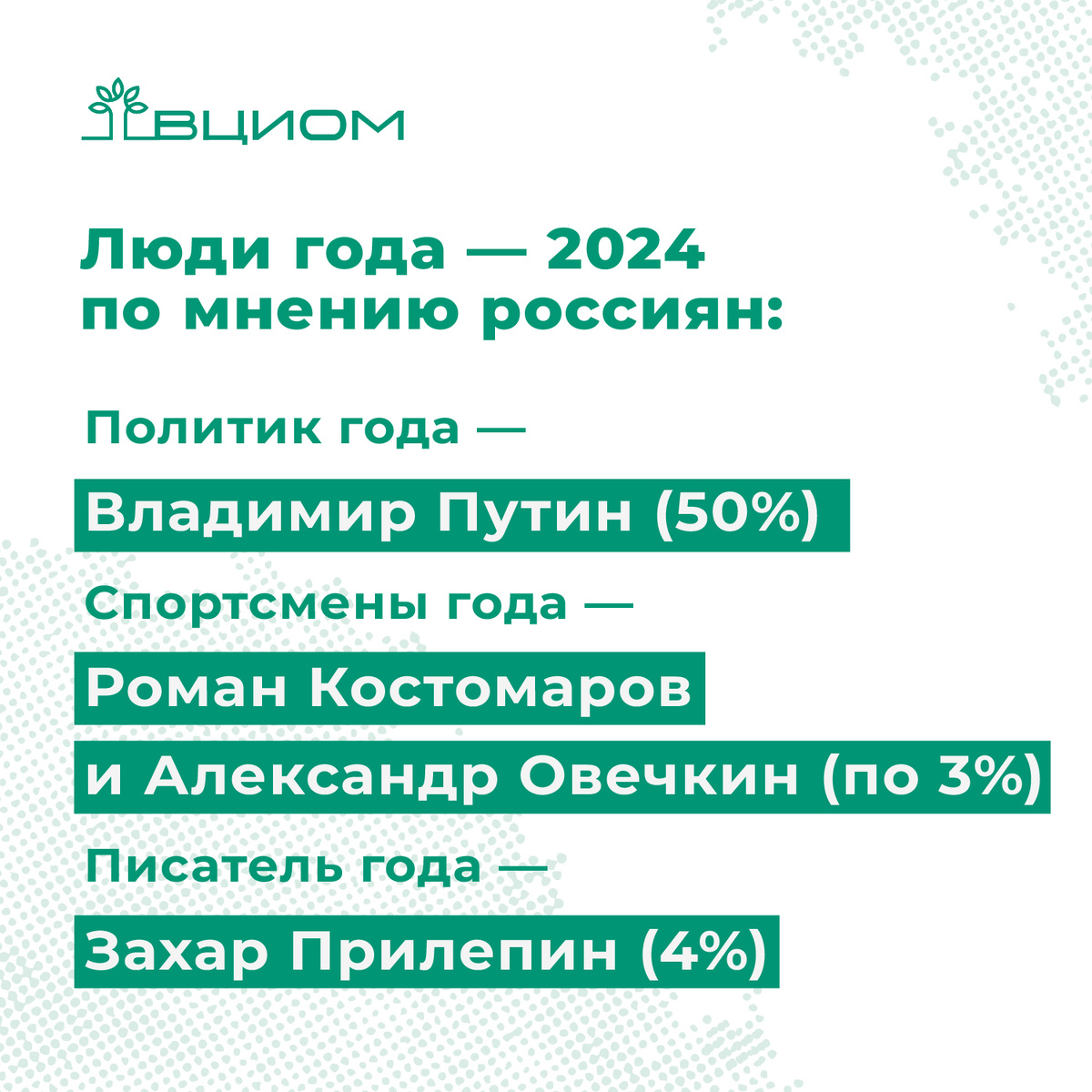 №3 — Сергей Лавров, министр иностранных дел (14%) Первое место в рейтинге спортсменов ушедшего года разделили Роман Костомаров и Александр Овечкин (по 3%). Другие спортсмены не набрали более 1%. Писателем года россияне пятый год подряд признают Захара Прилепина (4%). Большинство (77%) затруднились с ответом на этот вопрос, ещё 5% сказали, что таких писателей нет.