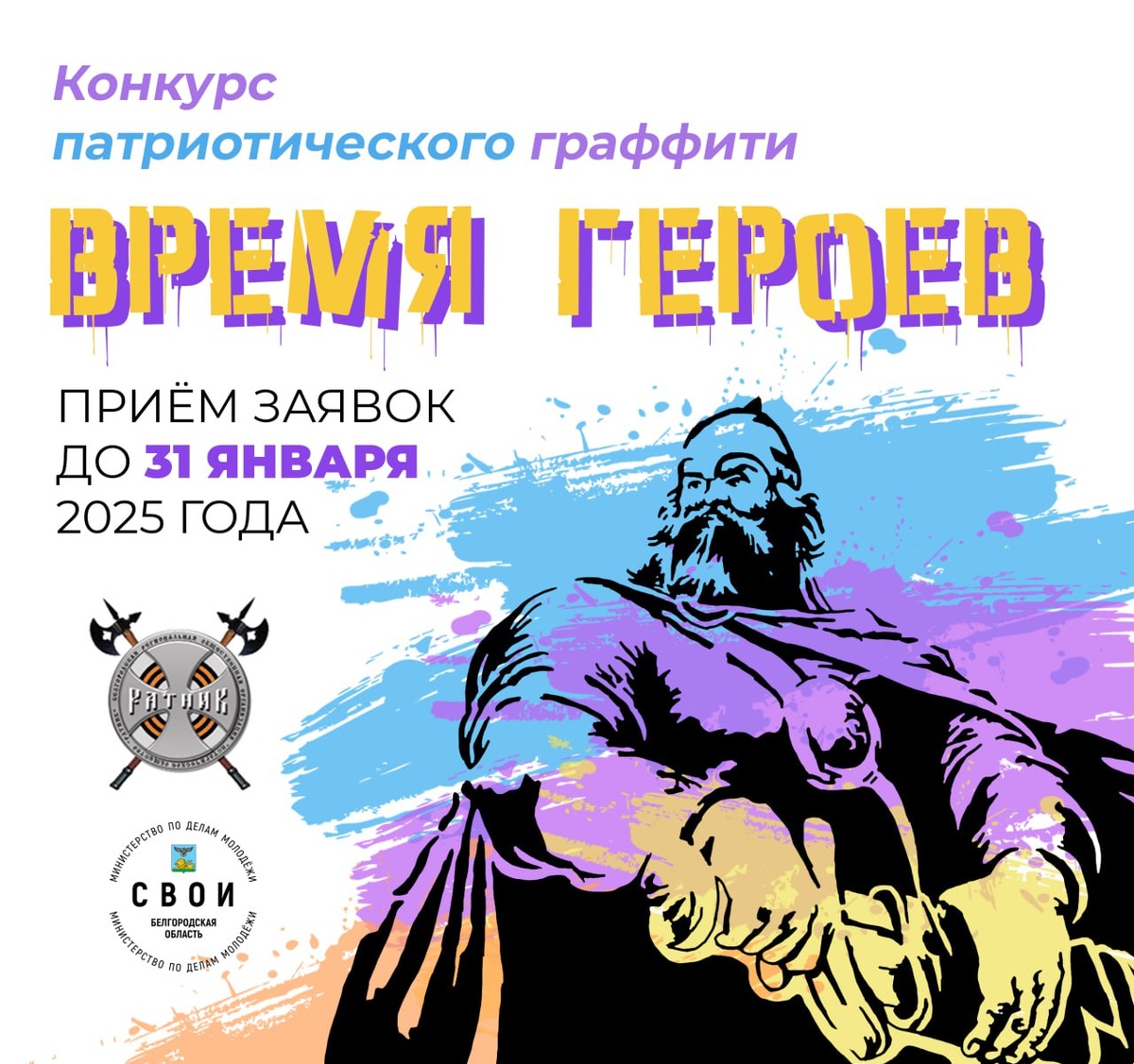 Каждый желающий может принять участие в проекте от Исторического общества «Ратник» при поддержке министерства по делам молодёжи и украсить города Белгородской области своими произведениями. Участники могут выбрать следующие темы: ⏺«Выдающиеся личности Белгородской области»; ⏺«Исторические события»; ⏺«Духовно-нравственные ценности»; ⏺«Волонтёры»; ⏺«Курсанты военно-патриотических клубов»; ⏺«Герои СВО». Отправить заявку на конкурс можно до 31 января. Подробная информация тут.