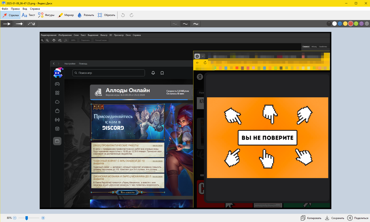 Существует множество способов создания скриншотов на компьютере. Выбрал один из них — с помощью программы Яндекс.Диск. Обычно не нужно обмениваться скриншотами через этот сервис, просто полностью устраивают функциональность и скорость работы программы. 1. Горячая кнопка которой пользуюсь в 99% 100% случаев - ctrl+shift+1 - делает снимок области экрана -выделяешь мышкой нужную область и всё, сразу запускается редактор скриншота. Быстрый и не ресурсозатратный. 2. У меня всегда есть Photoshop, и я часто его использую. Однако я предпочитаю работать с утилитой от Яндекс.Диска. В ней есть все необходимые функции: возможность добавлять стрелки, размывать изображения, кадрировать и вставлять текст. При этом всё работает очень быстро и качественно. 3. По умолчанию после нажатия кнопки «Сохранить» внизу окна скриншот автоматически отправляется в облако, что позволяет сразу начать работу с ним удалённо. В бесплатной версии автоматически сохранить скриншот на компьютер нельзя, но после нажатия «С