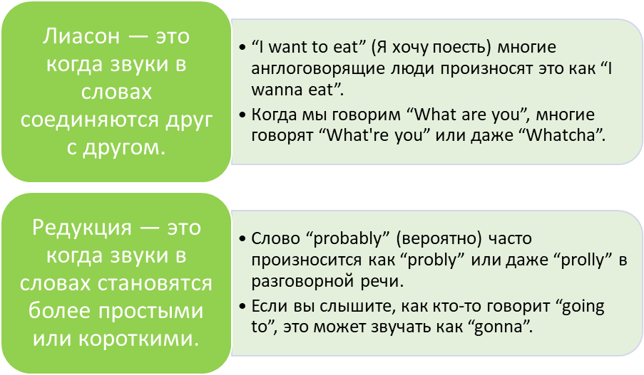 Лиасон — это когда звуки в словах соединяются друг с другом. Представьте, что вы разговариваете с другом, и некоторые слова сливаются, чтобы звучать более плавно. Например, в фразе “I want to eat” (Я хочу поесть) многие англоговорящие люди произносят это как “I wanna eat”. Здесь “want to” стал “wanna”. Это делает речь более быстрой и естественной.