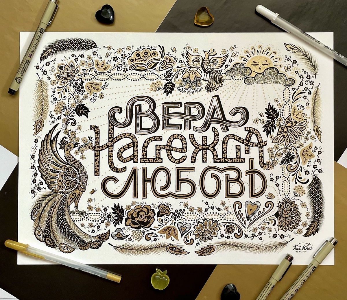 Здравствуйте друзья! 🤗 Вера, Надежда, Любовь. Что знаем мы о них? Часто ли задумываемся о значении этих слов? Три сестры, три христианских добродетели и три русских (первоначально греческих) женских имени. Хотела было пофилософствовать, да решила, что лучше каждому, самому над этим задуматься. Это сочетание слов стало распространённым художественным образом. Вот и я решила его использовать в своей работе. Черновик слов готовила в рамках онлайн курса по леттерингу, с поддержкой куратора. Далее, оформление, декор и цветовое решение - моя буйная фантазия.😁 Получился такой вот рисунок - леттеринг с важными словами, значение которых, думаю, понятно каждому. Мы вступили в Новый 2025 год. И мне хочется пожелать всем Веры, Надежды и Любви! Пусть Вера, в лучшее, в себя, в своих близких, будет крепкой! Пусть Надежда, горит ярким огнем и не дает свернуть с намеченного пути! Пусть Любовь, наполняет, окутывает и конечно окрыляет! 💗💗💗🤗