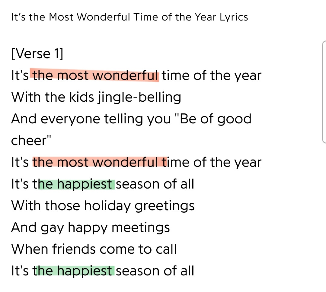 Всем привет! В этой статье я разберу куплет песни Кайли Миноуг "It's the most wonderful time of the year" (Это самое замечательное время года). Конечно же в песне речь идёт о Рождестве (Christmas). Превосходная степень используется, когда сравнивают больше двух объектов - объект сравнивают с группой объектов. Например, самый ... в мире / in the world; из всех / of all. Перед прилагательным в превосходной степени всегда стоит артикль the или притяжательное местоимение (your, his, our...). Если прилагательное односложное, его превосходная степень образуется путем прибавления суффикса -(e)st. Happy - the happiest (самый счастливый) Многосложные прилагательные образуют превосходную степень с помощью the most. Wonderful - the most wonderful (самый замечательный) Учить английский язык с песнями легко и весело. Включите песню "It's the most wonderful time of the year" Kylie Minogue и спойте её. В этой композиции в тексте встречаются оба прилагательных, о которых я упоминула выше. Красивая пес