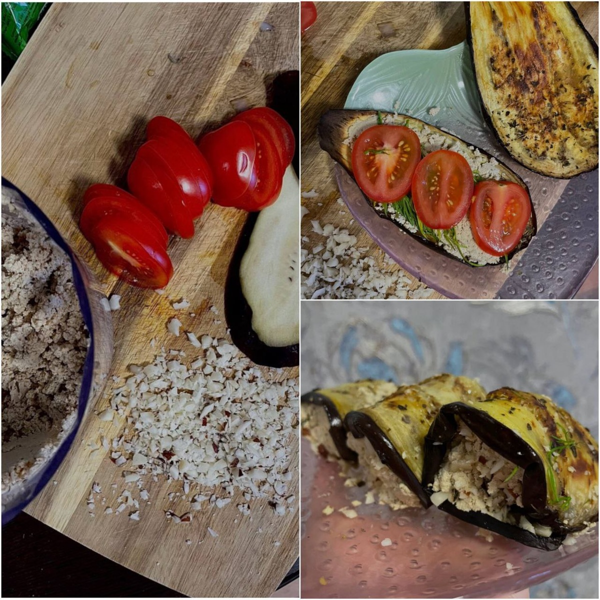 РУЛЕТЫ ИЗ БАКЛАЖАНОВ 🍆 Рецепт закуски к новогоднему столу от моей ученицы. Ингредиенты: 🔸баклажаны 🔸тофу классический 🔸зелень 🔸помидор 🔸специи 🔸орехи 🍆🧀🥬🍅🥜 ✅ режем баклажан тонкими слайсами, запекаем в духовке, предварительно сбрызнув оливковым маслом и посыпав солью, орегано, сушеным чесноком и сушеным базиликом. Запекаем 20 минут при 200°. Лист лучше застрелить пергаментом. ✅ тофу соединяем с солью, перцем, сушеным чесноком и взбиваем в блендере до консистенции крема. Можно добавить зелень, какая вам нравится. ✅ намазываем на готовые баклажаны тофу, кладем зелень и помидор. ✅ измельчаем орешки, тут по вашему вкусу. При приготовлении блюда на фото - бразильский, можно грецкий. ✅ скатываем баклажан в рулетик, по бокам добавляем тофу в пустоты и обмакиваем бока в измельченный орех. Наслаждаемся 💕 Вариации начинки 🫒 — копченый тофу и нори — классический тофу и шампиньоны — классический тофу, вяленые помидоры, маслины, базилик Приятного аппетита!