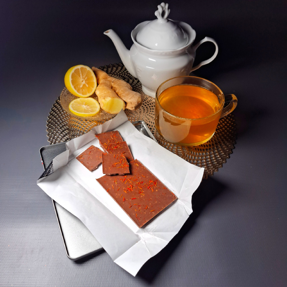 В чайнике - зеленый чай, травы, лимон и имбирь.