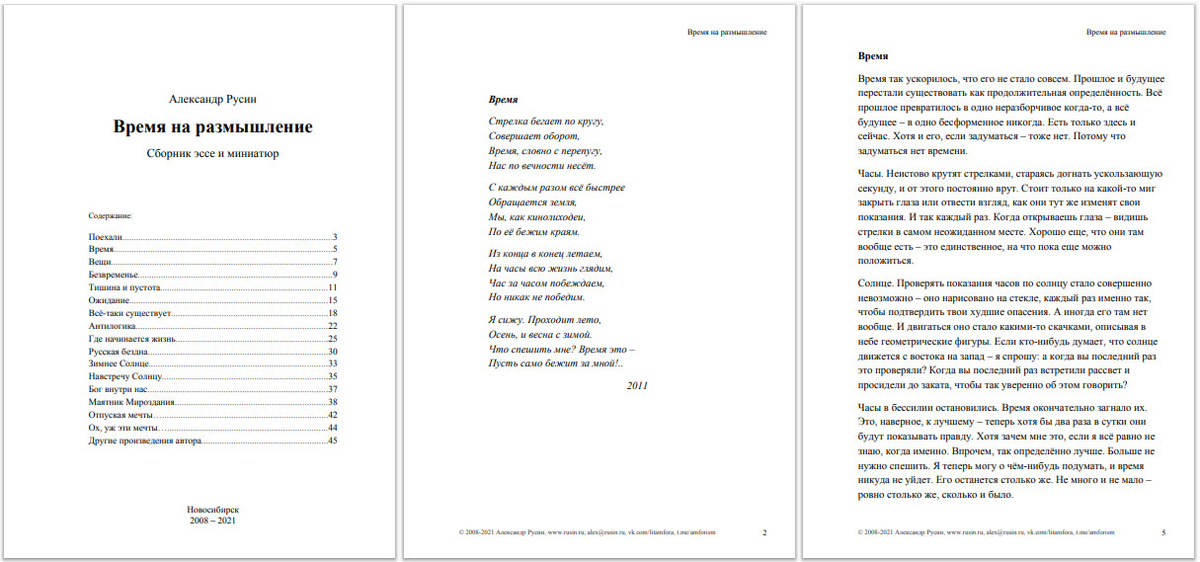 Подготовлены электронные версии сборников эссе: Время на размышление - 16 эссе 2011 года, 40 стр. Сборник эссе и миниатюр с размышлениями о времени, вещах, безвременье, ожидании, логике, отношениях, русском народе, высших силах и мироздании. Большая часть вошедших в сборник работ была написана в 2011 году. Эти эссе являются одними из первых моих серьезных произведений и могут считаться началом работы в сфере публицистики. Космос и землянки - 4 эссе, 32 стр. Эссе с рассуждениями о существовании инопланетного разума, об уникальности человека, о его миссии во Вселенной и о фундаментальных началах - принципе маятника, втором начале термодинамики и энтропии, о стремлении жизни, в том числе разумной, заполнить собой всё доступное пространство. Из наших окон был виден космос - 3 эссе и рассказ, 20 стр. Эссе историко-политической направленности, связанные с космической темой.