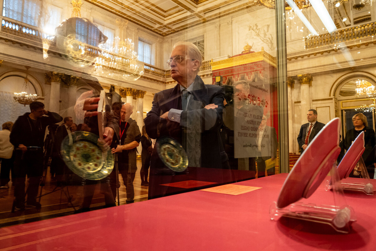 Одна из давних традиций Эрмитажа – представлять на завершающей выставке наиболее значимые дары, пополнившие собрание музея за текущий год. В этот раз посетители главного музея страны смогут увидеть четыре тарелки с российскими двуглавыми орлами из Кремлёвского сервиза. Их преподнесла в дар Эрмитажу коллекционер исторического фарфора Екатерина Бородина. Как рассказала куратор выставки Ирина Багдасарова, эти предметы относятся к самой эффектной «золотой» группе парадного Кремлёвского сервиза. «Этот сервиз был изготовлен на Императорском фарфоровом заводе в Санкт-Петербурге в 1837–1838 годах, при императоре Николае I, и предназначался для Большого Кремлевского дворца в Москве», – уточнила специалист. Она добавила, что сервиз был рассчитан на очень много персон. «Одних только видов разных тарелок было четыре. И каждого вида тарелок должно было быть изготовлено по тысяче изделий». Автором работ стал художник Фёдор Солнцев, который, вдохновляясь царской золотой утварью XVII века из собрания