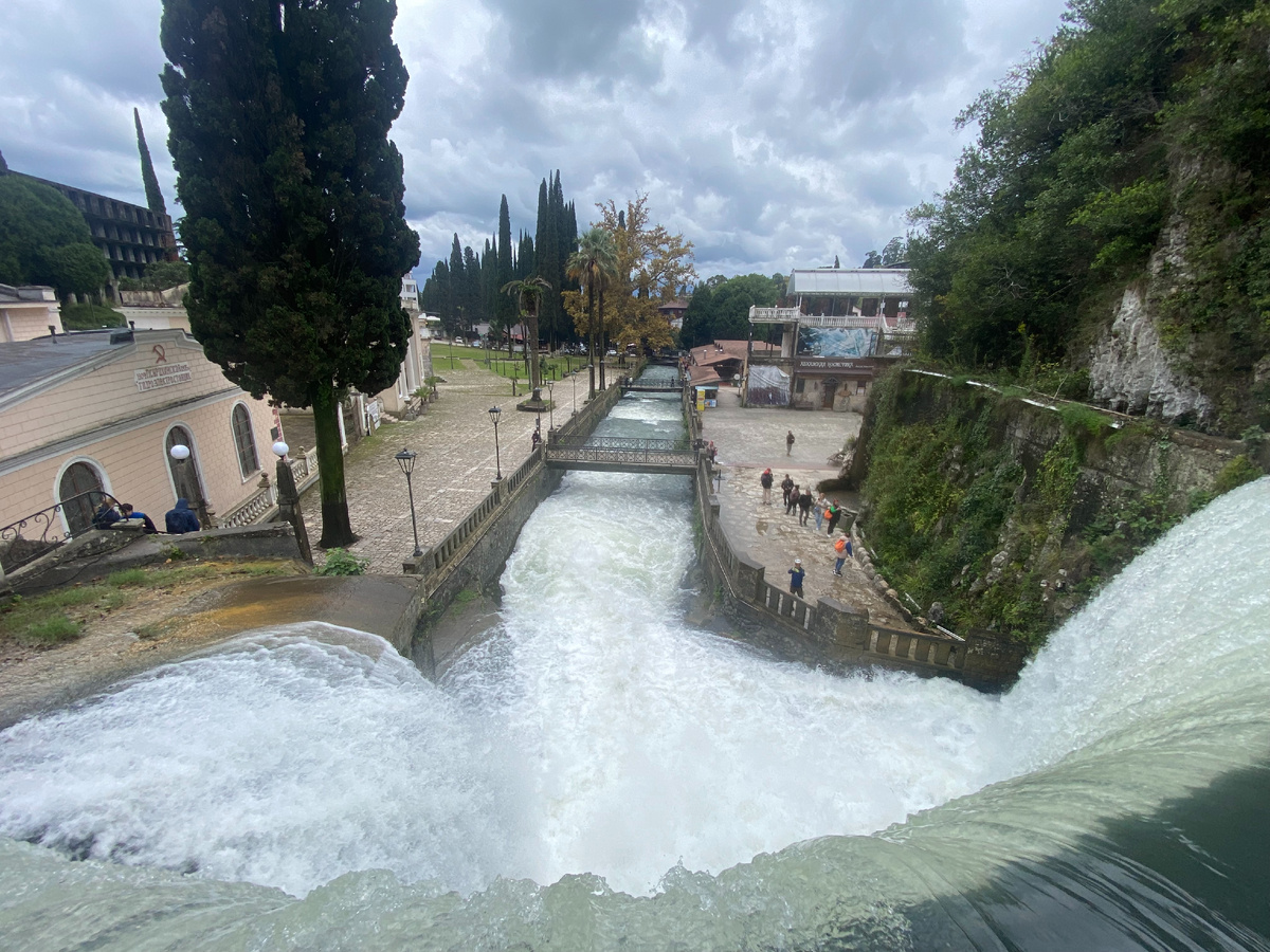 В Новый Афон мы приехали в понедельник. Именно, в тот день, когда у всех музеев официальный выходной :( И это означало, что были закрыты главные достопримечательности: Новоафонские пещеры, монастырь и Дача Сталина. Хорошо, что Новоафонский водопад не музей, туда мы и поехали! На самом деле, это не совсем водопад, а плотина гидроэлектростанции на реке Псырцха. В 1882-1903 годы в городе Новый Афон возводился гидротехнический комплекс, принадлежавший Новоафонскому Симоно-Кананитскому монастырю. Вначале была сооружена арочная плотина – Новоафонский водопад высотой в 8,6 метров и длиной 21,2 метра с двумя водопропускными отверстиями, шлюзами для отвода воды. Над гребнем плотины был устроен служебный мостик с ограждением в 70 сантиметров из каменной кладки с отверстиями для пропуска воды. Под водопадом были устроены обширные помещения – подвалы и холодильники для хранения продуктов, столь необходимые в жарком климате. Плотину гидроэлектростанции ввели в строй 7 декабря 1882 года. После этог