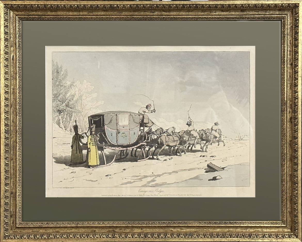 1. Английская литография с подрисовкой акварелью Д. А. Аткинсона (1775–1830) «Возок на полозьях» (1803) — 50 000 р.