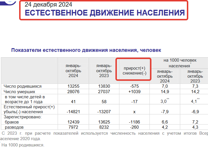 Естественная убыль населения Воронежской области за январь-октябрь текущего года составила 14 тысяч 821 человек, что на 1621 больше, чем за аналогичный период 2023 года. Рост этого нехорошего показателя увеличился на 10 процентов и объясняется сразу несколькими отрицательными факторами, о которых накануне сообщил Воронежстат. По его данным, за январь-октябрь 2024 года в нашем регионе сократилось число родившихся: на свет появилось всего 13 255 малышей, тогда как год назад их было 13 830. Уменьшение показателя на 575 человек. А вот показатель умерших – увеличился, если за 10 месяцев прошлого года таковых было 27 тысяч 307, то в текущем году – 28 тысяч 76. Умерших стало больше на 1039 человек. Таким образом, естественная убыль населения за 10 месяцев составила 14 тысяч 821 человек или в среднем 1482 человека в месяц. данные Воронежстата При такой тенденции, когда на одного родившегося приходится два умерших человека, показатель естественной убыли населения по 2024 году может быть около 1
