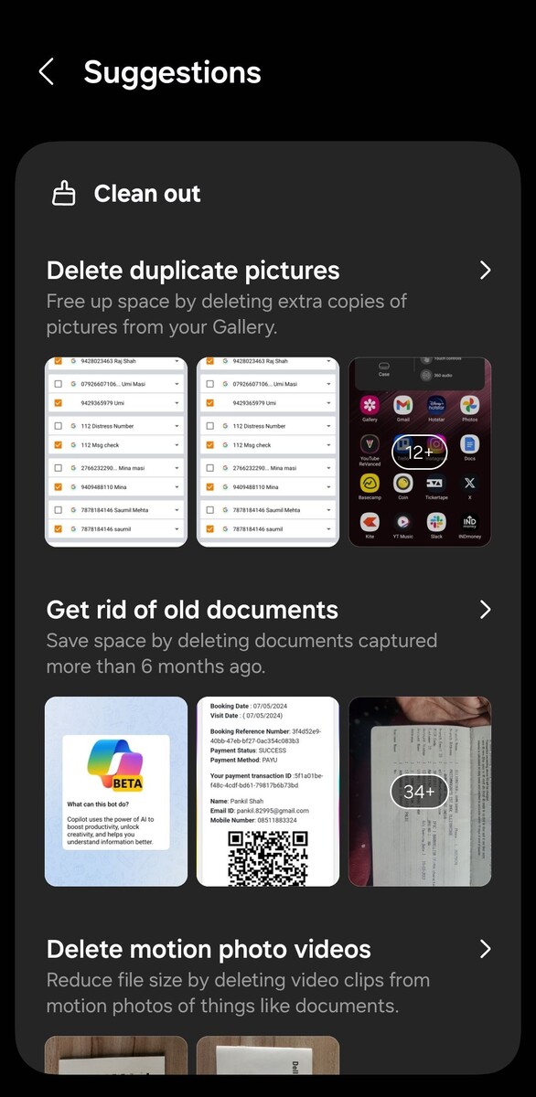 Также есть функция предложений в Samsung Gallery, которую я считаю невероятно полезной. Она быстро определяет и предлагает дубликаты и устаревшие фотографии, позволяя мне удалять их всего лишь несколькими нажатиями. Этот уровень эффективности и управления фотографиями — то, чего нет в Google Photos.