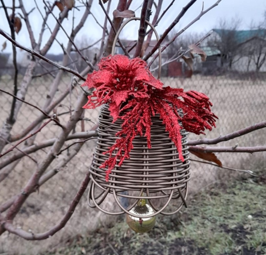 Если продолжить дальше, то последует вопрос - что глядите на меня темно-голубые? На самом деле мои колокольчики совсем другого цвета. Этот из бронзового прутка 3 мм (Гатчина): Плела его по мастер-классу с канала "Плести ротанг. РотангАрт": Этот колокольчик сплетен по мастер-классу Светланы Горлановой. Белый пруток тоже Гатчина, но уже 2 мм. Комбинировала его с полутрубкой джинс. Кто производитель, не знаю, но ротанг шикарный, мне очень понравился. И колокольчик, вроде ничего получился. Правда, я еще не научилась колпачок нормально плести, но это дело поправимое. Посмотрела мастер-класс с канала фабрики Ratteco. Ну и ВКонтакте нашелся еще один мастер-класс. Думаю, этого достаточно, чтобы сплести какой угодно колокольчик. Пока я сплела всего два колокольчика, но это только начало. Дело в том, что у меня есть идея-фикс - купить большую красивую искусственную ёлку, поставить перед домом и всю украсить самодельными игрушками. Колокольчики из ротанга подходят для этой цели просто идеально.