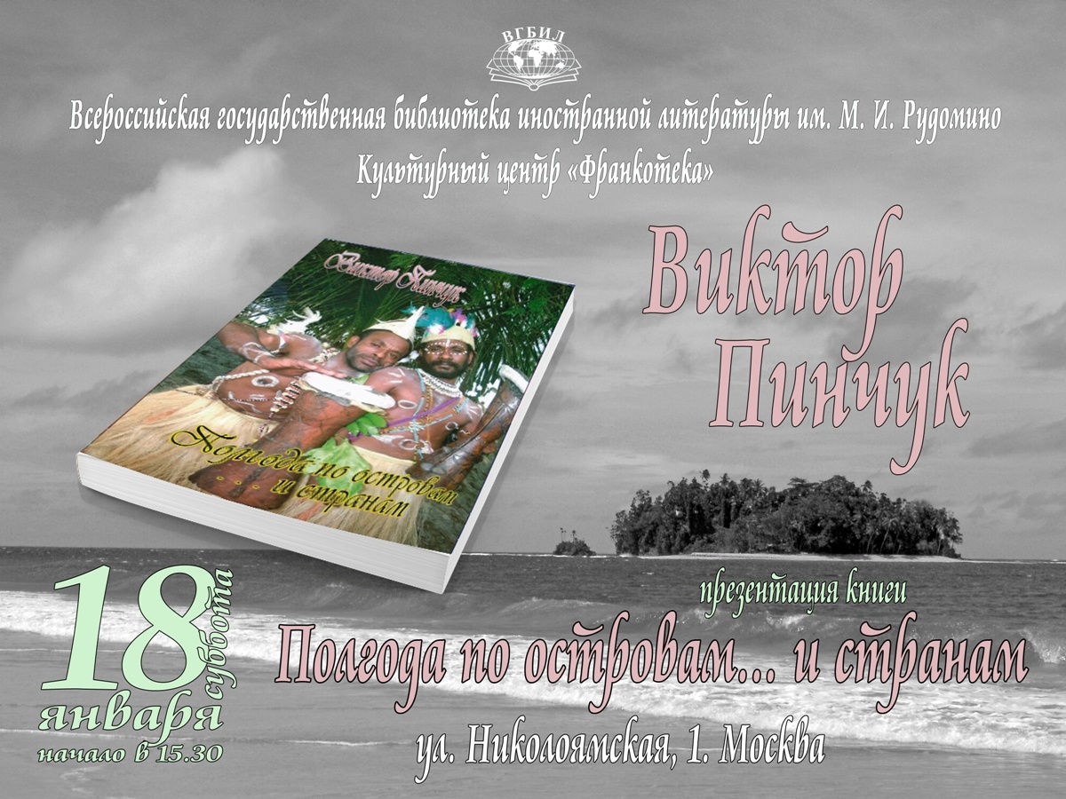 Пытаясь разрушить стереотипы, некто Виктор Пинчук — российский журналист и писатель, объехавший 58 экзотических стран (включая 40 островов) проведет творческую встречу во Всероссийской государственной библиотеке иностранной литературы имени М. И. Рудомино. В рамках мероприятия будет представлена авторская книга «Полгода по островам… и странам», где описан маршрут, включивший девять экзотических государств, в т. ч. Папуа-Новую Гвинею, ради которой предпринята одиночная экспедиция.