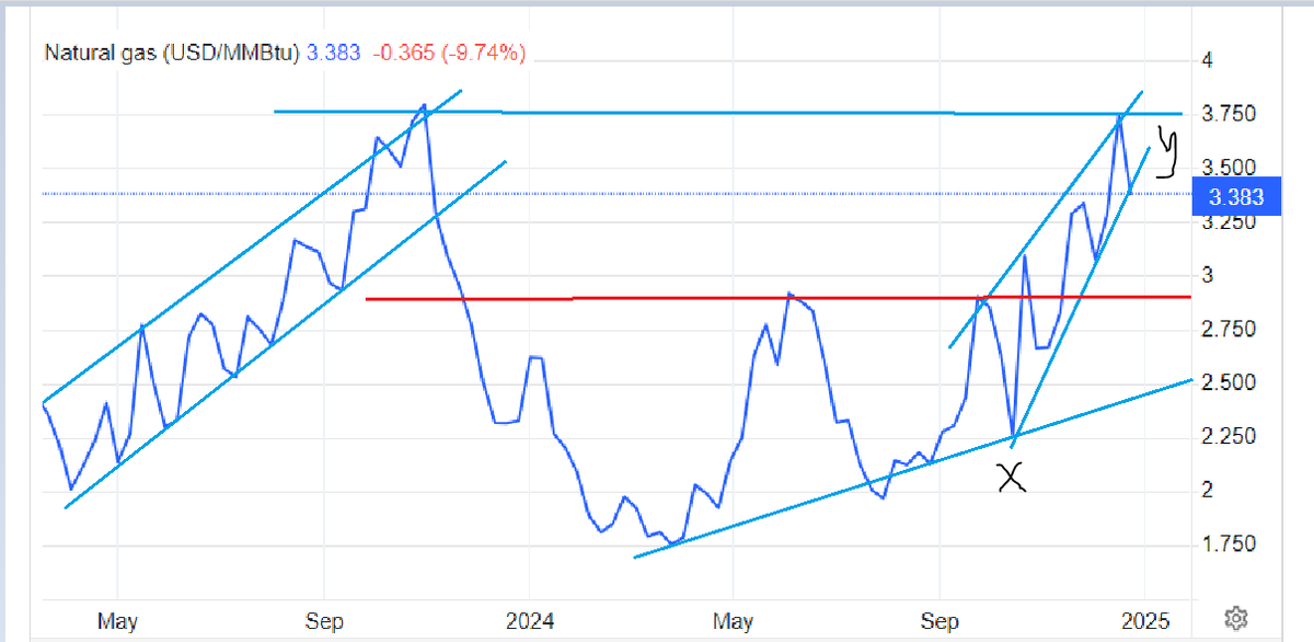 Проанализировал картинку цен газа на NYMEX нарисовал себе видение Видеться мне что цену откатить должны на 2,9 концу января Это подтверждается прогнозной динамикой запасов Попытаюсь объяснить в колонке W я рассчитал предполагаемые дынные по запасам на следующие 4 недели на основе данных сайта bluegoldtrader . Сейчас размер профицита газа в хранилищах составляет 125 BCF что на 3,83 % выше 5 летней средней. При этом цена газа находиться в диапазоне 3,3-3,7 $ Так как до этого росли то За нулевой уровень следует взять соотношение +5% к запасам это 3 доллара цена. Так было исторически. Это можно перепроверить на сайте eia.gov То есть 3 доллара это некий нормальный уровень цены при нормальном уровне запасов. При текущем прогнозе погоды (а погода уже известна на 4 недели вперед) , профицит запасов увеличиться за Январь 2025 на 0,65 % в относительном отклонении от 5 летней средней запасов но сократиться до +107 BCF с текущих +125 BCF на 31.01.2025 . Получается по запасам мал