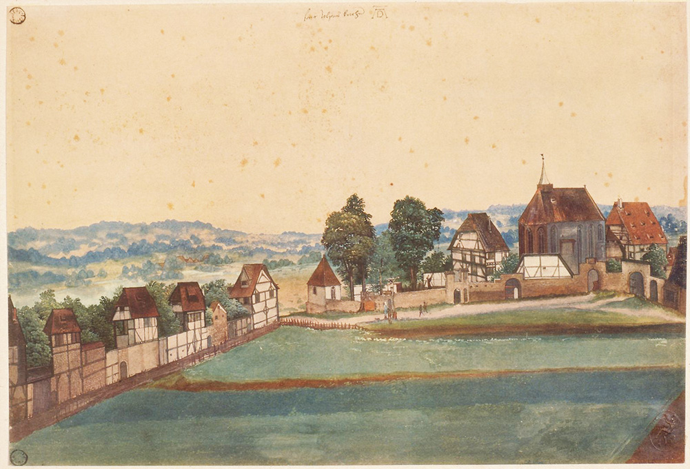 Следующая акварель теперь считается одной из самых ранних пейзажных картин в европейском искусстве, изображающих определенное место. Альбрехт Дюрер (1471–1528), вероятно, закончил её летом 1489 года, в возрасте восемнадцати лет. На картине, подписанной «Церковь Святого Иоанна», изображена внушительная церковь и ряд домов, расположенных к западу от Нюрнберга. Почти сорок лет спустя художника похоронили на кладбище этой церкви. Изображенный пейзаж, открывающий вид почти с высоты птичьего полета, обращен на юг, к далеким холмам за ним. Художник приложил большие усилия, чтобы точно запечатлеть сцену в мельчайших деталях. Картина была похищена во время Второй мировой войны и пропала почти на пятьдесят лет. Она принадлежала Кунстхалле в Бремене и находилась среди тысяч рисунков старых мастеров, которые были спрятаны для сохранности в подвале особняка в пятидесяти милях от Берлина. В 1945 году Красная Армия заняла дом. Виктор Балдин, молодой офицер, нашел Церковь Святого Иоанна на п