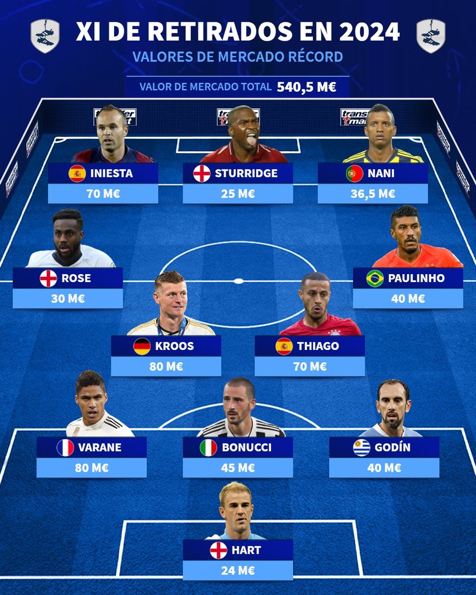 2024 год для многих футболистов стал последним в профессиональной карьере, лишь некоторые игроки вешали бутсы на гвоздь в статусе легенды. Возможно, самым болезненным стал уход Тони Крооса – клубный сезон 34-летний немец закончил с тремя трофеями. Ради домашнего Евро полузащитник возобновил карьеру в сборной: и Карло Анчелотти, и Юлиан Нагельсманн признавались, что хотели бы продолжить работу с Тони, но игрок решил уйти на пике. Кроос не единственный, чья великая карьера подошла к финалу в 2024-м. 33-летнего Тиаго Алькантару и 31-летнего Рафаэля Варана замучили травмы, Андрес Иньеста смог попрощаться с футболом лишь в 40 лет. Transfermarkt составил символическую сборную из игроков, повесивших бутсы на гвоздь в уходящем году. Помимо Крооса, Тиаго и Варана в команду вошли Дэниэл Старридж, Нани, Дэнни Роуз, Паулиньо, Леонардо Бонуччи, Диего Годин и Джо Харт. Если сложить наивысшую трансферную стоимость в карьере каждого игрока этой сборной, получится внушительная сумма – 540,5 млн евро! П