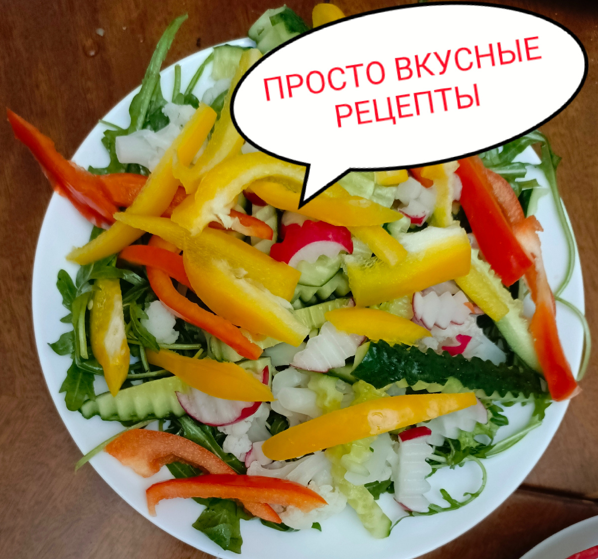 Очень красивый и вкусный салат. Заранее моем все продукты и отвариваем цветную капусту. Даем стечь воде. Красиво режем овощи. А вот соединяем их в салат только перед подачей на стол. На большое блюдо или лист, как у нас, красиво выкладываем листья салата. Сегодня смесь салатов. Сверху выкладываем нарезанные фигурным ножом пластиками вдоль огурцы, болгарский перец, отваренную цветную капусту, консервированную кукурузу, редиску, синий лук. Заправляем растительным маслом. У нас подсолнечное. Можно добавить помидоры. Сохраняйте, комментируйте и подписывайтесь на канал "ПРОСТО ВКУСНЫЕ РЕЦЕПТЫ".