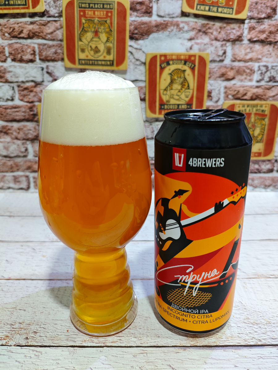 Двойной IPA на трёх Citra: Incognito, Spectrum и Lupomax от пивоварни 4BREWERS (ООО "Четыре пивовара") из города Владимир. Как всегда у Четырёх пивоваров описание на этикетке полностью дублирует описание на сайте: "Все яркие рок-звёзды, что озаряют нас своим творчеством, в самом начале пути были еле заметным сиянием. Пробираясь сквозь терни усердной работы, они покрывали свои сердца толстым панцирем так, чтобы ничего не сломило их волю. Проходя эти сложные испытания судьбы, многие закрывали от чужих глаз свои переживания. Преображая свои эмоции, они создавали то, чему вторили сотни струн других душ… Насыщенный светлый эль. Сильный и сложный цитрусово-хвойный вкус хмеля. Сбалансированный чистый солодовый вкус дополняет высокую хмелевую горечь." ********************************************************************************** Плотность: 19%. Горечь: засекречена. Состав: вода подготовленная (исправленная), солод пивоваренный ячменный, хмель гранулированный, дрожжи пивные. Срок годности: