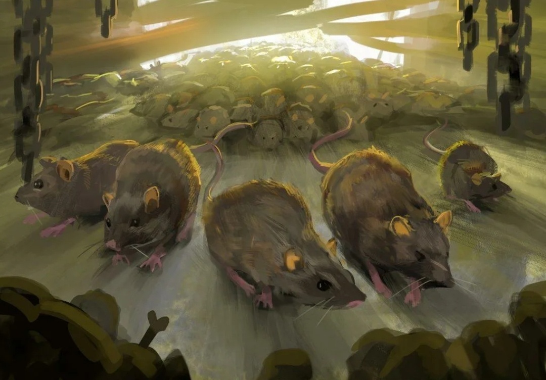 Среди куч и гор потерянных ценностей на полу сидел человек с мешком на голове, рядом с ним Ядвига Карловна со связанными руками и перед ними расхаживал Колбасов, вокруг которого по спирали двигались полчища крыс, покрывая полностью кирпичный пол.