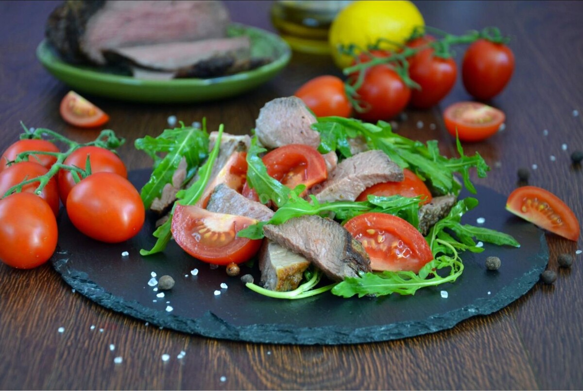 Вымойте листья рукколы и порвите руками, сложите зелень поверх мяса.