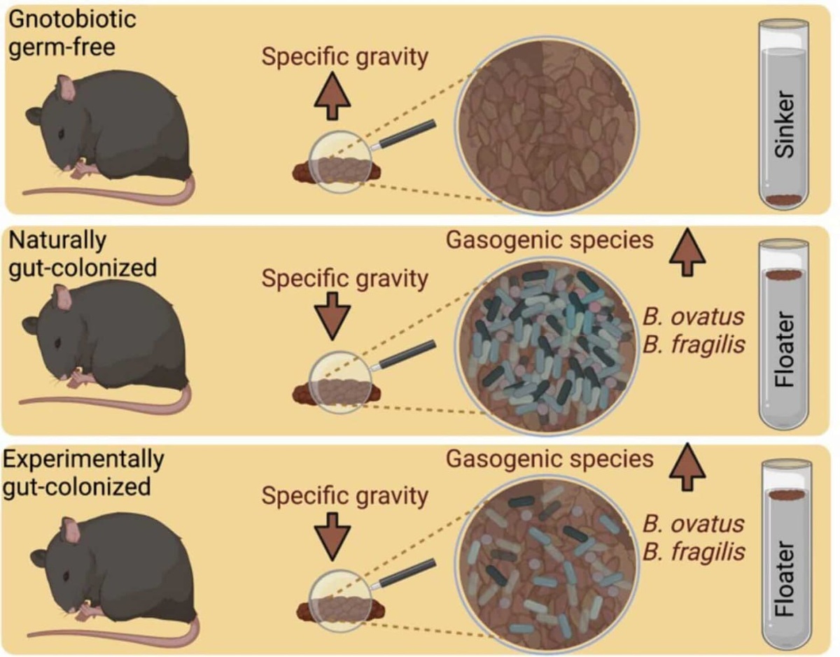 Долгие годы считалось, что кал остаётся на плаву благодаря жирам в его составе. Последнее исследование полностью опровергло эту теорию. • У стерильных грызунов кал всегда тонет, но стоит добавить в их кишечник бактерии – и у половины мышей «результат» начинает всплывать. • Оказалось, что дело в особых бактериях, которые выделяют газ, не позволяющий «подлодке» уйти ко дну. Помимо этого, исследование помогло учёным разработать новые методы диагностики кишечных заболеваний.