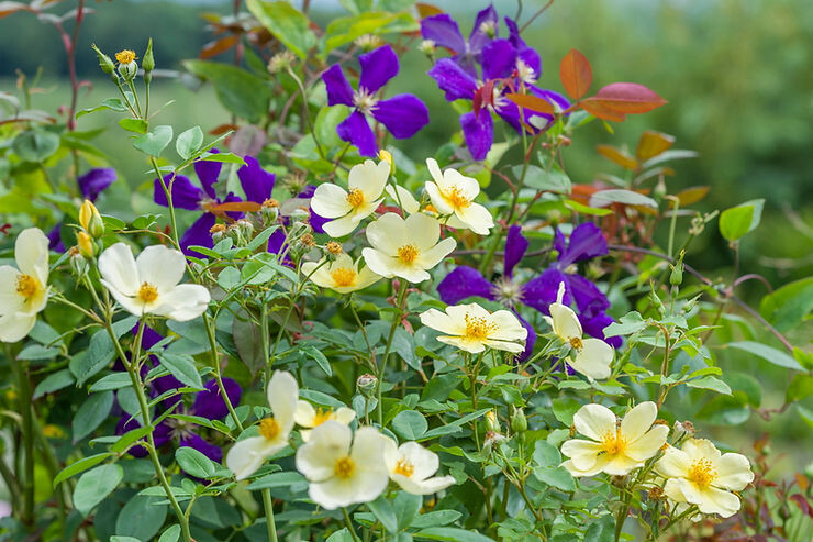 Кустовые розы — идеальные партнеры, поскольку клематисы находит хорошую опору на колючих побегах розы. Но подойдут и другие деревья или обелиски поменьше.