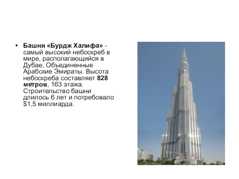 На данный момент самым высоким зданием в мире является Бурдж-Халифа в Дубае, ОАЭ. Его высота составляет 828 метров.