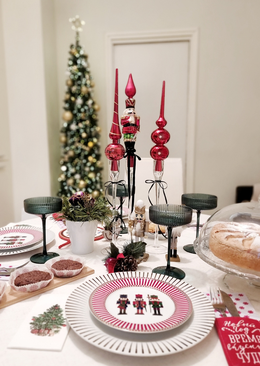 Этот новый год у нас очень необычный. Я наготовила салатов, накрыла новогодний стол, а сама уехала в отпуск. Все просто — к нам приехали гости. Родители мужа решили встретить Новый год в Петербурге вместе с моей мамой и тётей. Мы не увиделись, так как разминулись, но к их встрече я подготовилась. И сегодня их встречали нарядные новогодний стол и елка. Кто давно читает мой канал, знает, что уже несколько лет я собираю новогоднюю щелкунчиковую сервировку. В этом году она пополнилась центральной композицией из подсвечников, верхушек для елок, бокалами, фигурками щелкунчиков (елочные украшения) и конвертами для сервировки из фетра. Расскажу подробнее про верхушки. Щелкунчик (Kaemingk) — это стеклянная фигурка 29 см. Она продавалась с бархатным бантиком. А вот две соседние верхушки я купила в Ленте. Это пластик стоимостью 130 руб. Возможно потом планомерно поменяю их на стекло, сейчас же решила поумерить свой пыл, так как суммы, которые ежегодно трачу на новогодний декор и так совсем