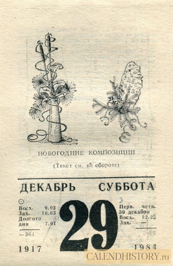 Итак, сегодня 29-го декабря и у нас на календаре 1984-й год. Перед нами листок советского календаря для женщин за этот день. На календаре у нас суббота - 29 декабря 1984-го года. НОВОГОДНИЕ КОМПОЗИЦИИ (Текст см. на обороте) *** Оборотную сторону листка этого календаря можно посмотреть у нас по ссылке на сайте. Другие листки советских календарей смотрите у нас на сайте - CALENDHISTORY.ru ДРУГИЕ ЛИСТКИ ОТРЫВНЫХ КАЛЕНДАРЕЙ: