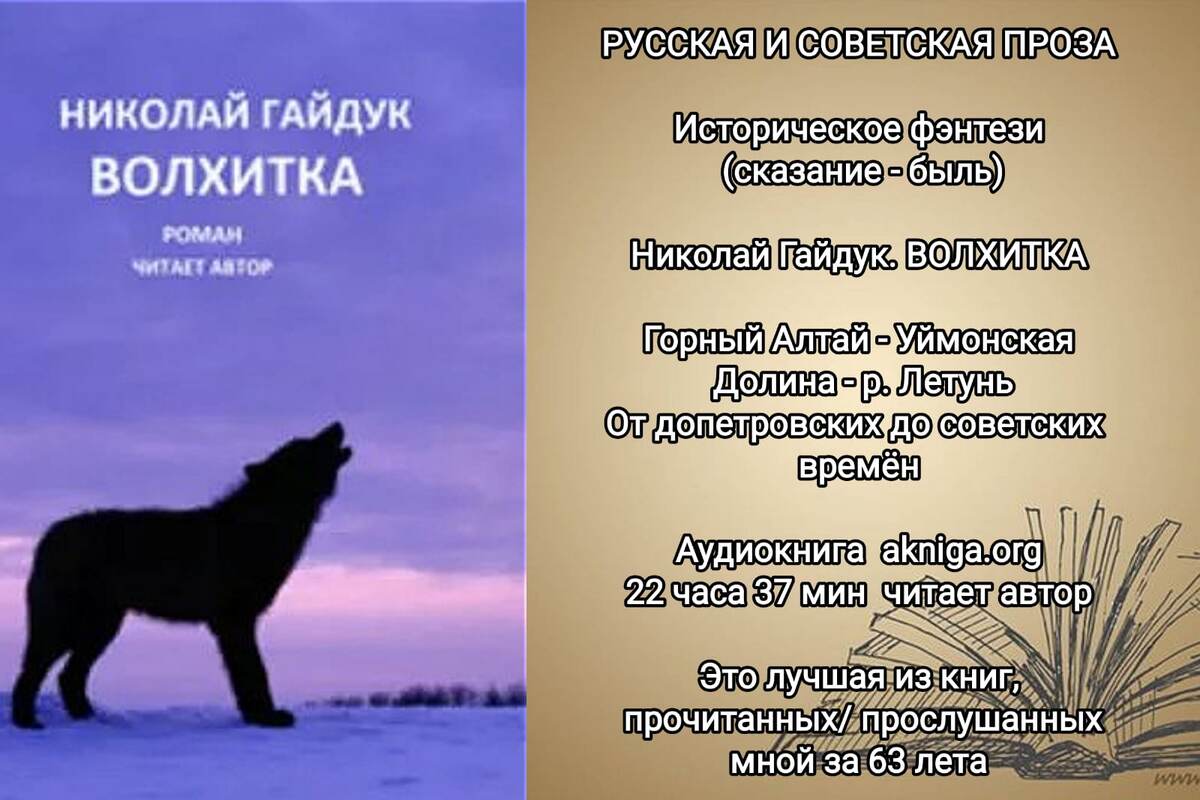 Жанр книги, на современном языке, - историческое фэнтези, а на ранешнем - сказание - быль. Аудиокнига состоит из нескольких глав, разбитых на фрагменты. Удивительно! Действие происходит в разные времена, разные жизненные ситуации и герои... Но эти разности абсолютно незаметны для читателя. Наоборот! Текст книги текуч, подвижен. Повествование, подобно горной реке, журчит, переливается, манит читателя за собой в славные времена наших Предков... Волхитка - это Чаровница, Колдунья, Волшебница. Николай Гайдук родился в селе Волчиха Алтайского края. Созвучие названия села и этой сильной знаковой книги автора не случайны! Волхитка - Берегиня алтайской Земли и хранительница древних Знаний. Собирательный образ. Она предстаёт пред читателем то в образе белой волчицы, то верной жены и добропорядочной матери четверых сыновей Златы, то беловодской иконы Божией Матери... Это сейчас каждая религия ставит себя особняком, устанавливает свои жёсткие каноны и правила. А раньше, в ведические и староо