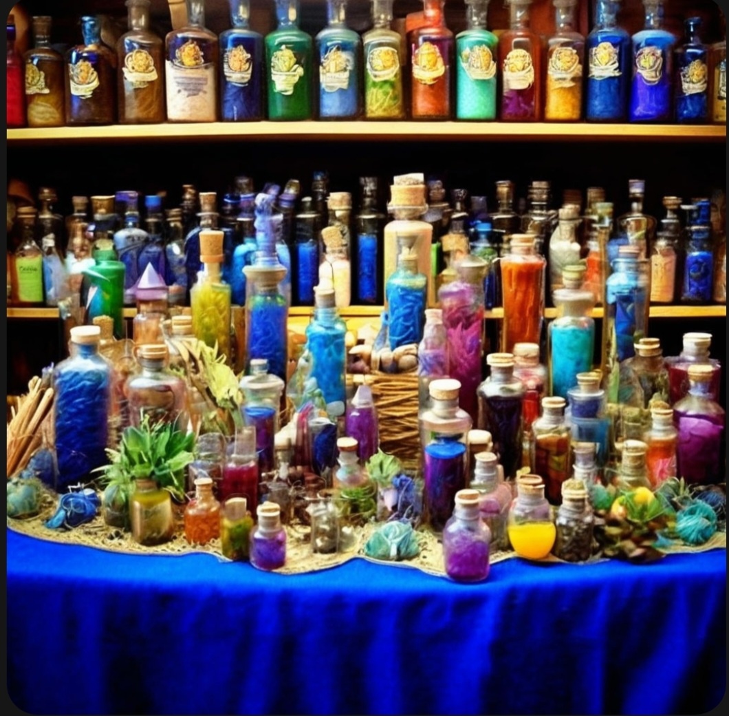 Я кивнул ей и стараясь меньше останавливаться шёл следом. Мы подошли к лавке украшенной синей тканью с таинственными манящими узорами, где и правда уже стояло много людей, но не так, что бы к ней было не подойти. На прилавке было представлено много различных флаконов разных форм и разноцветных жидкостей, что они содержали. Так же можно было увидеть различные вещицы, букеты и веники разнообразных трав и цветов. Глазами даже смог найти известный корень мандрагоры. Предполагаю, она была засушена, ведь её гримаса страданий вызвала у меня мурашки по спине. Всё же я сосредоточился на флаконах и решил проверить одру игровую теорию.