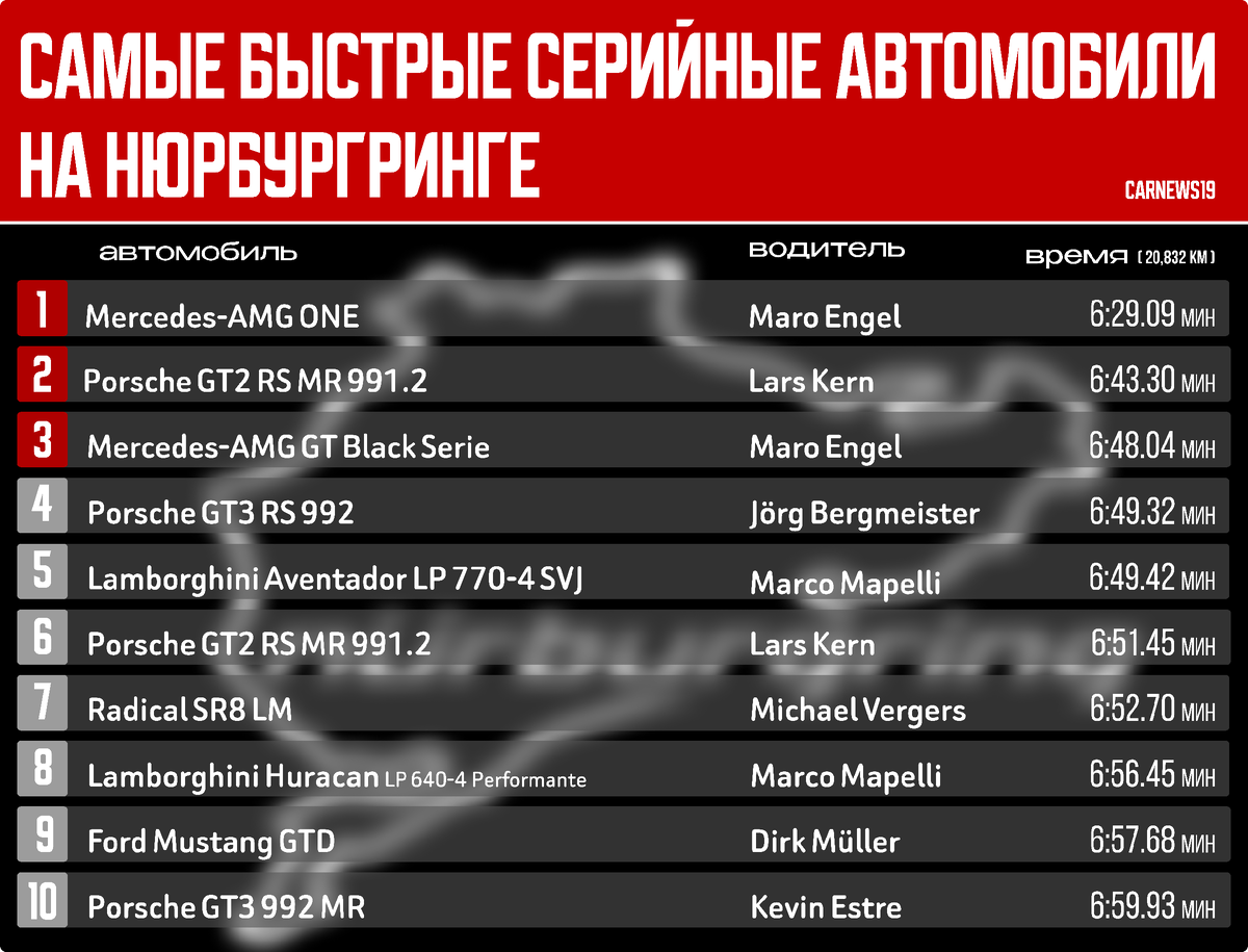 Нюрбургринг — одна из самых известных и сложных гоночных трасс в мире. Её протяжённость составляет 20,83 километра, и она предназначена для проверки автомобилей и навыков вождения. В течение многих лет гонщики стремились доказать, что их машины лучшие, но только немногим удавалось попасть в десятку лучших (6:49.42 мин) (6:56.45 мин)