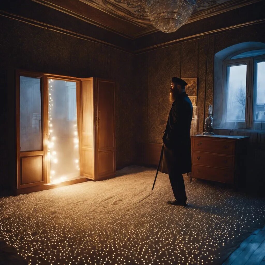 когда ночь опустилась на город Саратов, Георгий, обычный автомеханик, как и все люди, кому не в ночь ложился спать. уже лёжа под одеялом он осматривает свою комнату. обычная, со старыми обоями, телевизором а-ля 80-е. и конечно же ковром на стене. Георгий прислушался. дом засыпал. тишина становилась уютной, родной. но что-то было не так. что-то скреблось на грани слышимости... Георгий всё сильнее чувствует что что-то не так. что-то странное, доносится из... шкафа. боясь шуметь, он аккуратно встаёт с кровати и двигается к старому шкафу, доставшегося ему от деда. слишком громоздкий чтобы его выбросить. вот и стоит, пыль собирает. звук становился все громче, казалось что весь дом уже слышит этот грохот. Георгий остановился. дом спал, все как обычно. словно нет этого страшного грохота и скрежета когтей. "кажется" подумал он и резко открыл шкаф и замер, постепенно бледнея. внутри стоял... дед. прозрачный,с пугающее мирной улыбкой.. и тут призрак ожил. он дико заорал и бросился на Георгия, пр